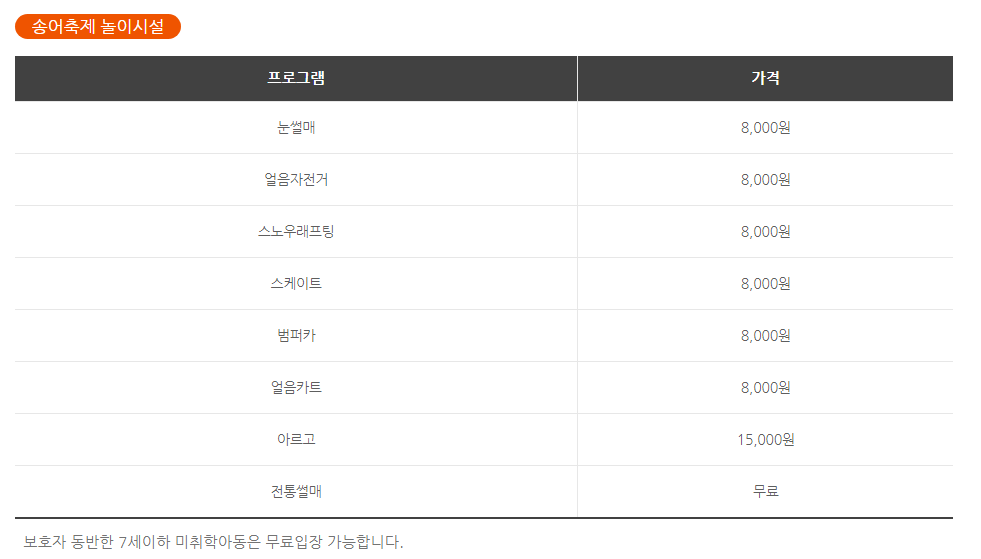 ● 눈/얼음 체험 : 눈썰매, 얼음썰매, 하늘 가르기, 얼곰이성 미끄럼틀, 얼음축구, 컬링, 피겨 스케이트, 빙판 버블슈트